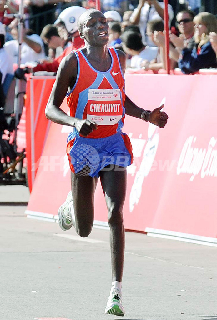 【10月13日 AFP】陸上、シカゴ・マラソン2008(Bank of America Chicago Marathon)。男子はケニアのエバンス・チェルイヨット(Evans Cheruiyot)が2時間6分25秒を記録し優勝を果たした。2位には2時間7分37秒を記録したデビッド・マンダゴ(David Mandago)が入り、3位には2時間11分39秒を記録したティモシー・チェリガト(Timothy Cherigat)が入り、ケニア勢が表彰台を独占した。(c)AFP