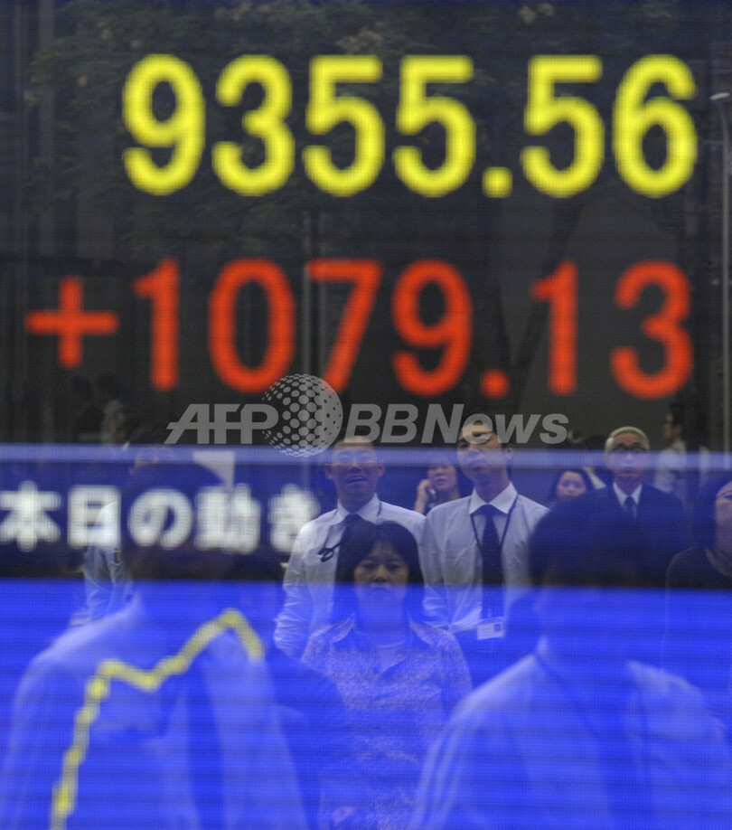 【10月14日 AFP】(一部更新、写真追加)14日午前の東京株式市場は、各国政府の金融機関救済策発表などを受け、急反発。取引開始直後から前週末比10%以上急騰し、日経平均株価の午前の終値は、前週末比1079円13銭(13.04%)高の9355円56銭となった。一時、これまで最大だった1990年10月2日の13.24%を超える上昇率を記録する局面もあった。