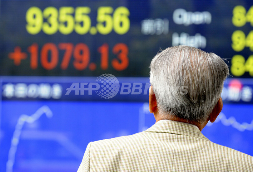 【10月14日 AFP】(一部更新、写真追加)14日午前の東京株式市場は、各国政府の金融機関救済策発表などを受け、急反発。取引開始直後から前週末比10%以上急騰し、日経平均株価の午前の終値は、前週末比1079円13銭(13.04%)高の9355円56銭となった。一時、これまで最大だった1990年10月2日の13.24%を超える上昇率を記録する局面もあった。