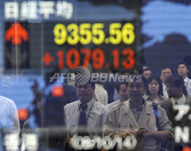 【10月14日 AFP】(一部更新、写真追加)14日午前の東京株式市場は、各国政府の金融機関救済策発表などを受け、急反発。取引開始直後から前週末比10%以上急騰し、日経平均株価の午前の終値は、前週末比1079円13銭(13.04%)高の9355円56銭となった。一時、これまで最大だった1990年10月2日の13.24%を超える上昇率を記録する局面もあった。