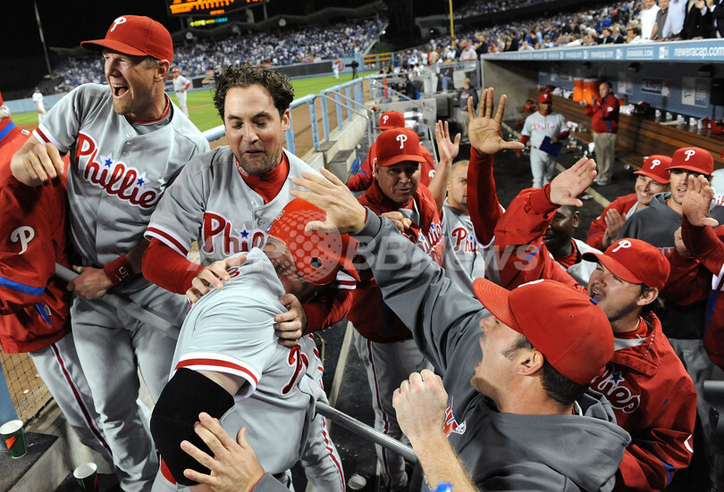 【10月14日 AFP】08MLBプレーオフ、ナ・リーグ優勝決定シリーズ、ロサンゼルス・ドジャース(Los Angeles Dodgers)対フィラデルフィア・フィリーズ(Philadelphia Phillies)第4戦。試合はフィリーズが7-5で逆転勝ちを収め通算対戦成績を3勝1敗とし、リーグ制覇に王手をかけた。