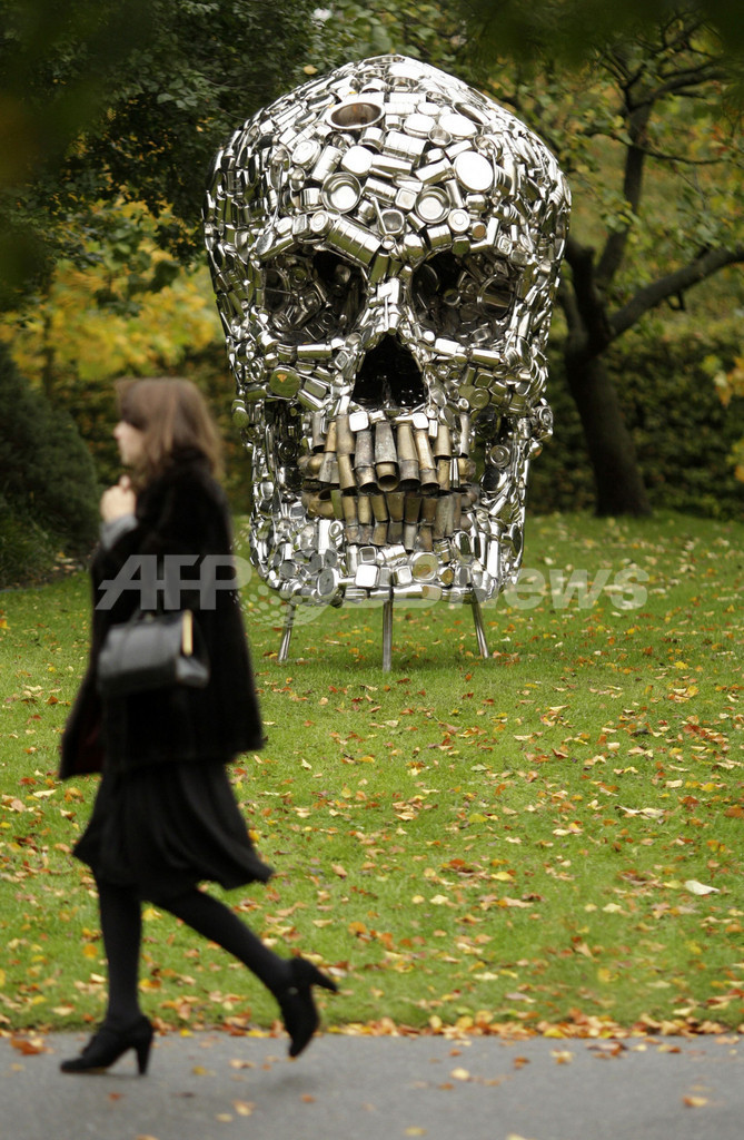 【10月16日 AFP】英ロンドン(London)のリージェント公園(Regent’s Park)に展示中の、台所用品を素材に使った「頭蓋(ずがい)骨」のアート作品。