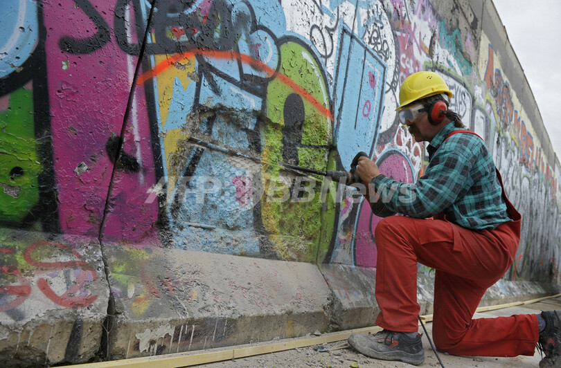 これらの作品は、1989年の壁崩壊から翌年にかけて全長1.3キロほどにわたりドイツ内外のアーティストがベルリンの壁に描いたもの。この壁の部分は「イーストサイド・ギャラリー(East Side Gallery)」との名前で知られ、保存されている。今回の復元作業では一度壁の表面を削り、オリジナルの作品を描いたアーティストたちに改めて描き直してもらう。ロシアのアーティスト、Wjatscheslaw Schljachowさんがトップバッターとなる。東西統一20周年を迎える2010年をめどに完成させる見通しだ。(c)AFP