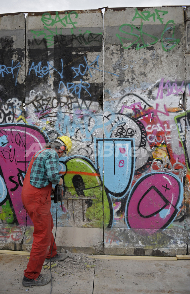 これらの作品は、1989年の壁崩壊から翌年にかけて全長1.3キロほどにわたりドイツ内外のアーティストがベルリンの壁に描いたもの。この壁の部分は「イーストサイド・ギャラリー(East Side Gallery)」との名前で知られ、保存されている。今回の復元作業では一度壁の表面を削り、オリジナルの作品を描いたアーティストたちに改めて描き直してもらう。ロシアのアーティスト、Wjatscheslaw Schljachowさんがトップバッターとなる。東西統一20周年を迎える2010年をめどに完成させる見通しだ。(c)AFP