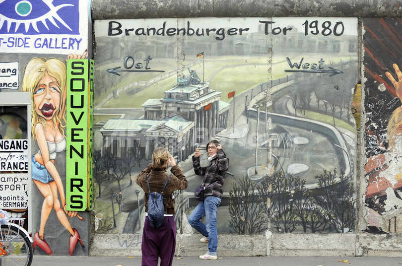 これらの作品は、1989年の壁崩壊から翌年にかけて全長1.3キロほどにわたりドイツ内外のアーティストがベルリンの壁に描いたもの。この壁の部分は「イーストサイド・ギャラリー(East Side Gallery)」との名前で知られ、保存されている。今回の復元作業では一度壁の表面を削り、オリジナルの作品を描いたアーティストたちに改めて描き直してもらう。ロシアのアーティスト、Wjatscheslaw Schljachowさんがトップバッターとなる。東西統一20周年を迎える2010年をめどに完成させる見通しだ。(c)AFP