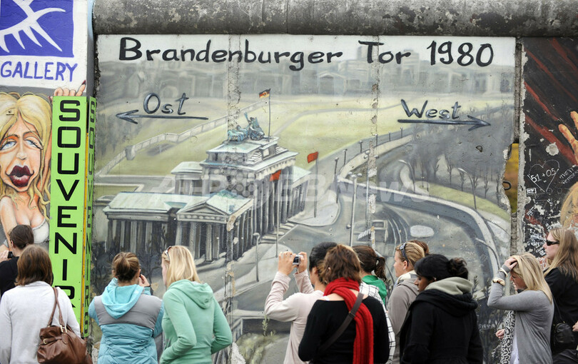 これらの作品は、1989年の壁崩壊から翌年にかけて全長1.3キロほどにわたりドイツ内外のアーティストがベルリンの壁に描いたもの。この壁の部分は「イーストサイド・ギャラリー(East Side Gallery)」との名前で知られ、保存されている。今回の復元作業では一度壁の表面を削り、オリジナルの作品を描いたアーティストたちに改めて描き直してもらう。ロシアのアーティスト、Wjatscheslaw Schljachowさんがトップバッターとなる。東西統一20周年を迎える2010年をめどに完成させる見通しだ。(c)AFP