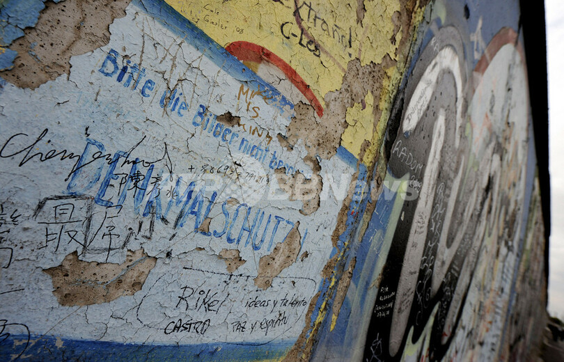 これらの作品は、1989年の壁崩壊から翌年にかけて全長1.3キロほどにわたりドイツ内外のアーティストがベルリンの壁に描いたもの。この壁の部分は「イーストサイド・ギャラリー(East Side Gallery)」との名前で知られ、保存されている。今回の復元作業では一度壁の表面を削り、オリジナルの作品を描いたアーティストたちに改めて描き直してもらう。ロシアのアーティスト、Wjatscheslaw Schljachowさんがトップバッターとなる。東西統一20周年を迎える2010年をめどに完成させる見通しだ。(c)AFP