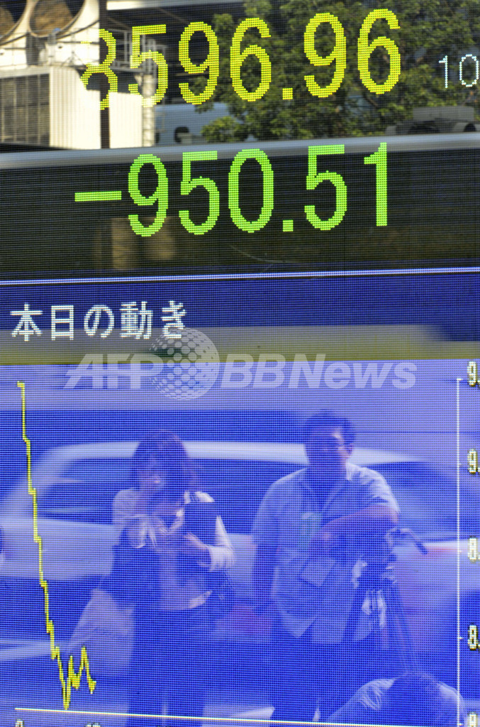 【10月16日 AFP】(一部更新、写真追加)16日朝の東京株式市場は、世界的な景気悪化懸念で15日の米市場が急落したことを受け、大幅に反落。日経平均株価は寄り付きから節目の9000円を割り込み、午前の終値は前日比911円91銭(9.55%)安の8635円56銭となった。一時、前日比1000円(10%)以上下落する局面もあった。