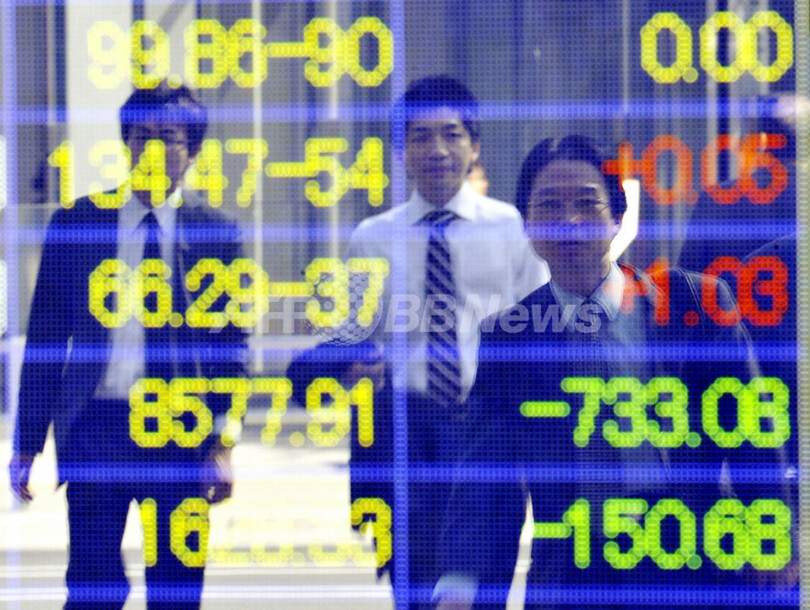 【10月16日 AFP】(一部更新、写真追加)16日朝の東京株式市場は、世界的な景気悪化懸念で15日の米市場が急落したことを受け、大幅に反落。日経平均株価は寄り付きから節目の9000円を割り込み、午前の終値は前日比911円91銭(9.55%)安の8635円56銭となった。一時、前日比1000円(10%)以上下落する局面もあった。