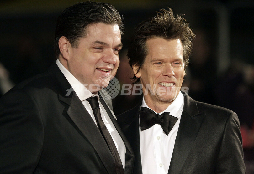 ロンドン(London)のレスター・スクエア(Leicester Square)で開催されたロン・ハワード(Ron Howard)監督の新作映画『Frost/Nixon』のワールド・プレミア上映会に登場した、出演俳優のオリヴァー・プラット(Oliver Platt、左)と、ケヴィン・ベーコン(Kevin Bacon、2008年10月15日撮影)。(c)AFP/Shaun Curry