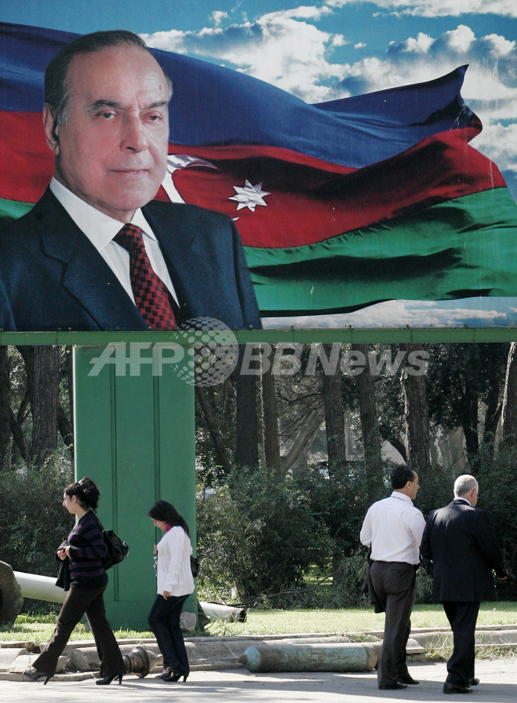 米露両国はカスピ海の膨大なエネルギー資源の獲得を目指してアゼルバイジャン政府を抱き込もうとしており、米政府はアリエフ大統領の非民主主義的な政策を批判する一方、重要なエネルギー同盟国として称賛している。(c)AFP