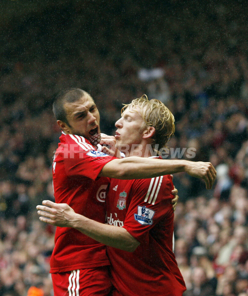 1-2とリードを許していたリバプールは、後半35分にアルベルト・リエラ(Albert Riera)が同点ゴールを決め、その5分後の同40分にカイトがジャーメイン・ペナント(Jermaine Pennant)のセンタリングに合わせ決勝点を決め、リバプールは首位のチェルシー(Chelsea)と同勝ち点で2位を守った。(c)AFP/Neil Johnston