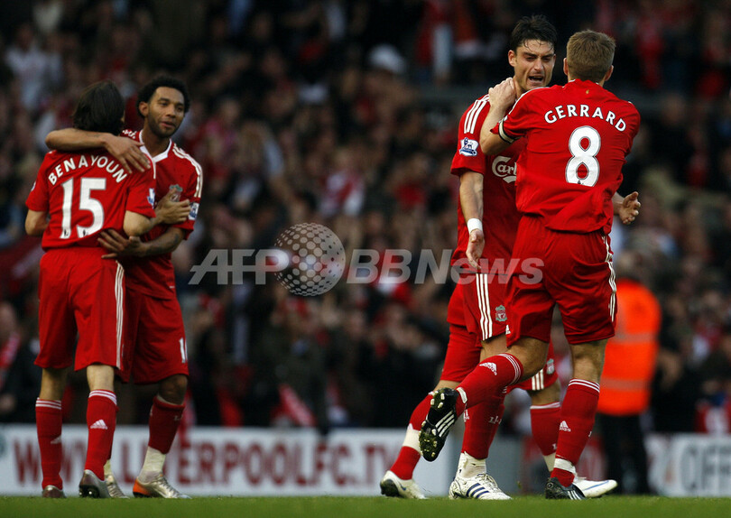 1-2とリードを許していたリバプールは、後半35分にアルベルト・リエラ(Albert Riera)が同点ゴールを決め、その5分後の同40分にカイトがジャーメイン・ペナント(Jermaine Pennant)のセンタリングに合わせ決勝点を決め、リバプールは首位のチェルシー(Chelsea)と同勝ち点で2位を守った。(c)AFP/Neil Johnston