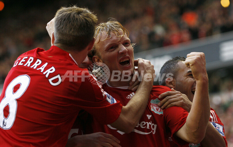 1-2とリードを許していたリバプールは、後半35分にアルベルト・リエラ(Albert Riera)が同点ゴールを決め、その5分後の同40分にカイトがジャーメイン・ペナント(Jermaine Pennant)のセンタリングに合わせ決勝点を決め、リバプールは首位のチェルシー(Chelsea)と同勝ち点で2位を守った。(c)AFP/Neil Johnston
