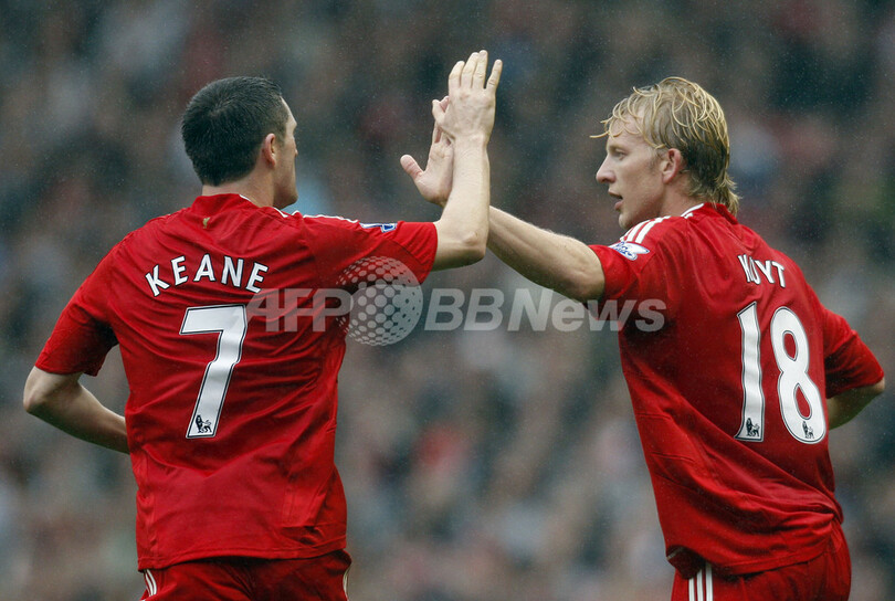 1-2とリードを許していたリバプールは、後半35分にアルベルト・リエラ(Albert Riera)が同点ゴールを決め、その5分後の同40分にカイトがジャーメイン・ペナント(Jermaine Pennant)のセンタリングに合わせ決勝点を決め、リバプールは首位のチェルシー(Chelsea)と同勝ち点で2位を守った。(c)AFP/Neil Johnston