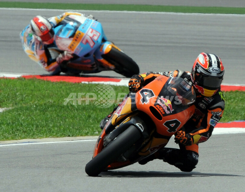 【10月19日 AFP】世界ロードレース選手権(WGP 2008)第17戦・マレーシアGP・250ccクラス決勝。ポールポジションからスタートしたメティス・ジレラ(Metis Gilera)のマルコ・シモンセッリ(Marco Simoncelli)は、43分04秒771を記録して決勝を3位で終え、自身初となる250ccクラス総合優勝を決めた。