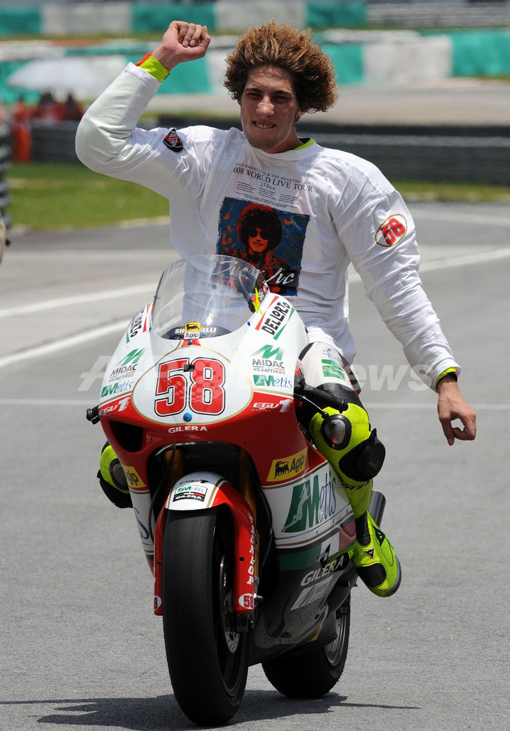 【10月19日 AFP】世界ロードレース選手権(WGP 2008)第17戦・マレーシアGP・250ccクラス決勝。ポールポジションからスタートしたメティス・ジレラ(Metis Gilera)のマルコ・シモンセッリ(Marco Simoncelli)は、43分04秒771を記録して決勝を3位で終え、自身初となる250ccクラス総合優勝を決めた。