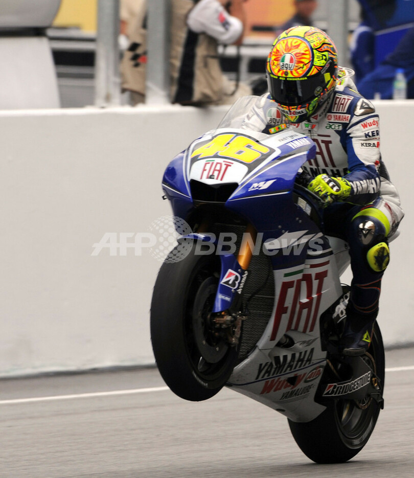【10月19日 AFP】世界ロードレース選手権(WGP 2008)第17戦・マレーシアGP・MotoGPクラス決勝。既に通算6度目となるMotoGPクラス総合優勝を決めている2番手からスタートしたフィアット・ヤマハ(Fiat Yamaha)のバレンティーノ・ロッシ(Valentino Rossi)は、43分06秒007を記録してシーズン9勝目を挙げた。