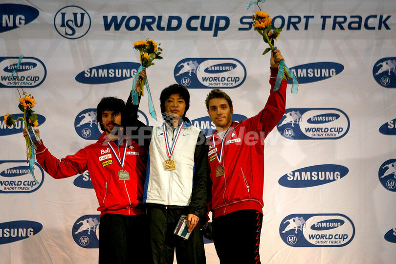 ショートトラック・スピードスケートW杯2008-09第1戦、男子500メートルの表彰式に臨む(左から)2位のフランソワ・ルイ・トランブレ(%%Francois-Louis Tremblay%%、カナダ)、優勝したSi-Bak Sung、3位のチャールズ・ハメリン(%%Charles Hamelin%%、カナダ)。(2008年10月19日撮影)(c)AFP/Getty Images/Matthew Stockman