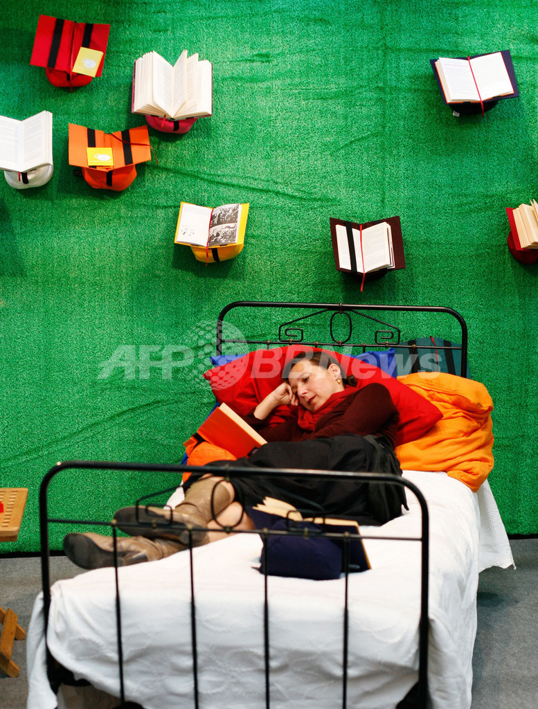 ドイツ中西部フランクフルト(Frankfurt)で100か国以上から約7000社が参加して開催された世界最大の書籍見本市「フランクフルト・ブックフェア(Frankfurt Book Fair) 2008」会場でベッドに横たわり本を読む女性。15日から行われていた同展示会は19日に閉幕した(2008年10月17日撮影)。(c)AFP/DDP/SEBASTIAN WILLNOW