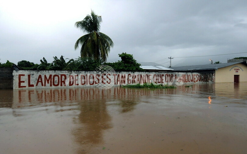 ホンジュラスでは20日、豪雨によって同国全土で少なくとも10人が死亡、2人が行方不明、数千人が避難を余儀なくされている。中米では弱い熱帯低気圧が停滞していることで1週間以上にわたって激しい雨が降り続いており、各国で洪水などの被害が出ている。写真は、首都テグシガルパ(Tegucigalpa)の北250キロにあるヨロ(Yoro)県エルプログレソ(El Progreso)で、同国最大の河川ウルア(Ulua)川のはんらんによる洪水の被害を受けたサンミゲル(San Miguel)郊外(2008年10月20日撮影)。(c)AFP/Orlando SIERRA