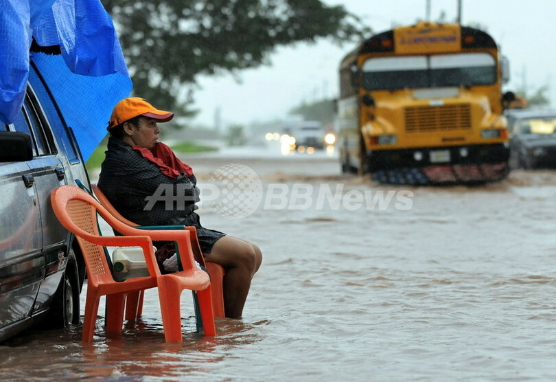 ホンジュラスでは20日、豪雨によって同国全土で少なくとも10人が死亡、2人が行方不明、数千人が避難を余儀なくされている。中米では弱い熱帯低気圧が停滞していることで1週間以上にわたって激しい雨が降り続いており、各国で洪水などの被害が出ている。写真は、首都テグシガルパ(Tegucigalpa)の北250キロにあるヨロ(Yoro)県エルプログレソ(El Progreso)で、同国最大の河川ウルア(Ulua)川のはんらんによる洪水の中で迎えを待つ女性(2008年10月20日撮影)。(c)AFP/Orlando SIERRA