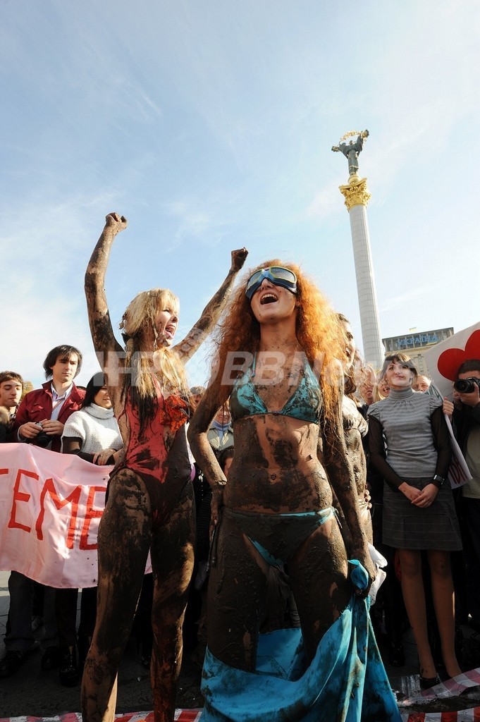 ニュース 政治・経済 こぼれ話 ドロドロ政治はもうたくさん! 水着の女性ら泥レスで抗議 2008年10月21日 10:59 発信地:キエフ/ウクライナ [ ロシア・CIS ウクライナ ] このニュースをシェア ‹ › ❮ 2/6 ❯ ウクライナの首都キエフ(Kiev)の独立広場で19日、泥レスリングのパフォーマンスで解散総選挙に抗議する女性権利団体「Femen」のメンバー(2008年10月19日撮影)。(c)AFP/SERGEI SUPINSKY 画像作成中 ! 【10月21日 AFP】ウクライナの首都キエフ(Kiev)の独立広場で19日、女性権利団体「Femen」のメンバーたちが水着姿で泥レスリングのパフォーマンスを行い、泥沼化したウクライナの政治状況に抗議した。メンバーたちは、先に議会を解散し12月7日に総選挙を行うとしたビクトル・ユーシェンコ(Viktor Yushchenko)大統領の決定に、異議を唱えている。(c)AFP 政治・経済 一覧へ> メディア・報道関係・法人の方向け 写真・動画 購入のお問合せ>