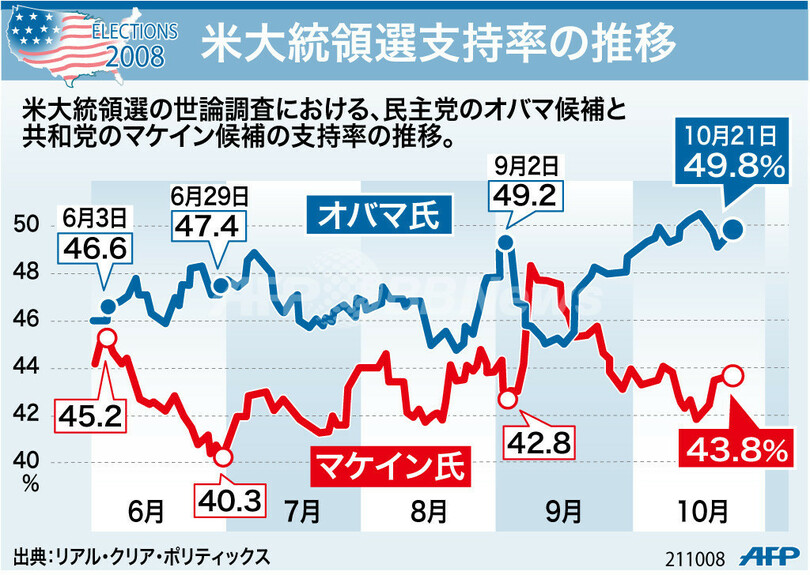 ニュース 政治・経済 図解 【図解】米大統領選、支持率の推移 2008年10月22日 11:06 発信地:米国 [ 北米 米国 ] このニュースをシェア (c)AFP 【10月22日 AFP】図は、米大統領選挙における、バラク・オバマ(Barack Obama)上院議員とジョン・マケイン(John McCain)上院議員の支持率の推移について示したもの。(c)AFP<ニュース解説画像一覧へ> 政治・経済 一覧へ> メディア・報道関係・法人の方向け 写真・動画 購入のお問合せ>