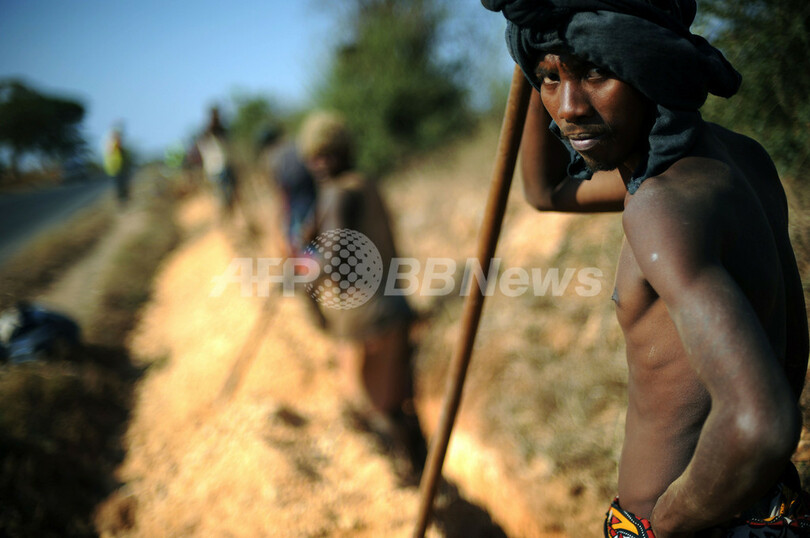 南西部沿岸の町トゥレアル(Tulear)と内陸部を結ぶ道路沿いのサカラハ(Sakaraha)でも、ケーブルを敷設するための溝を掘る作業が沿道で進められている。労働者の日当はわずか2ドル(約200円)だ。