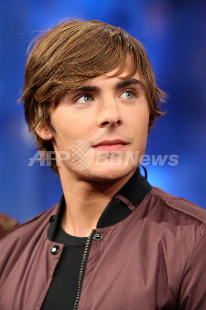 米ニューヨーク(New York)のタイムズ・スクエア・スタジオ(Times Square Studios)で行われたMTVの音楽番組「Total Request Live」に出演する、映画『ハイスクール・ミュージカル/ザ・ムービー(High School Musical 3: Senior Year)』キャストのザック・エフロン(Zac Efron、2008年10月21日撮影)。(c)AFP/Getty Images/Bryan Bedder