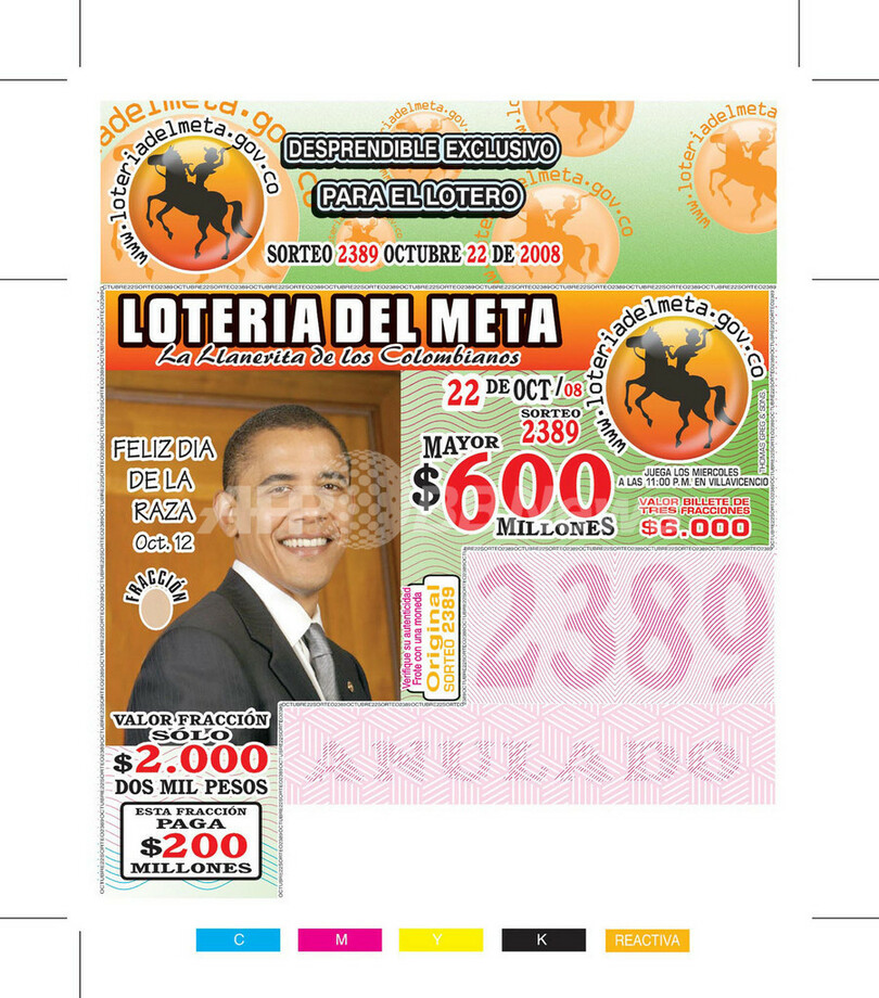 この宝くじは同国中部のメタ(Meta)県が発行したもの。すべての券にオバマ氏の肖像が使用され、売上げは好調だという。メタ県では宝くじ券に、世間で話題になっている「時の人」を採用しており、今回オバマ氏を選んだ理由も「米国の世論調査によると支持率でリードしており、現在、コロンビアで最も人気がある男性」から」だと、発行元の関係者は語っている。(c)AFP