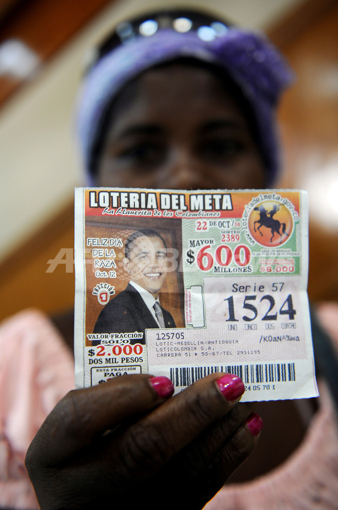 この宝くじは同国中部のメタ(Meta)県が発行したもの。すべての券にオバマ氏の肖像が使用され、売上げは好調だという。メタ県では宝くじ券に、世間で話題になっている「時の人」を採用しており、今回オバマ氏を選んだ理由も「米国の世論調査によると支持率でリードしており、現在、コロンビアで最も人気がある男性」から」だと、発行元の関係者は語っている。(c)AFP