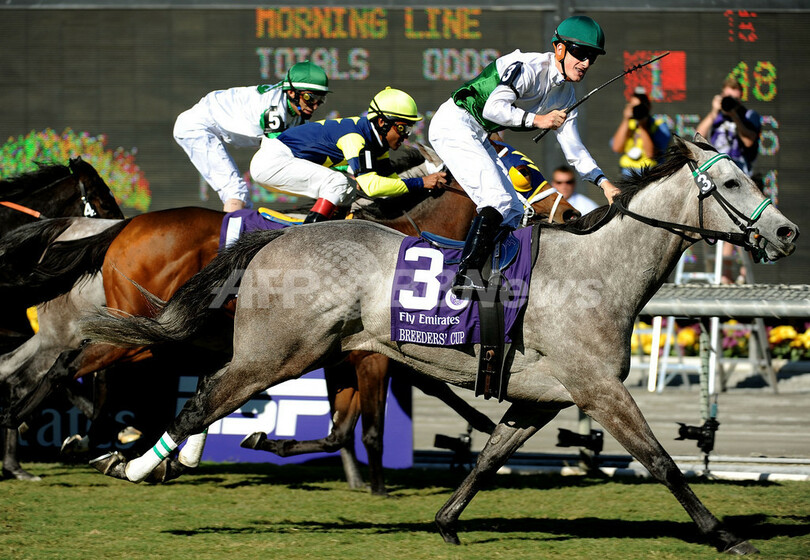 【10月25日 AFP】競馬、08ブリーダーズカップ・ワールド・チャンピオンシップ(2008 Breeders’Cup World Championships)フィリー&メアターフ。ジュリアン・レパルー(Julien Leparoux)騎手が騎乗のフォーエヴァートゥギャザー(Forever Together)が、外側から追い上げてゴール直前の競り合いを制し、2着のシーリーヒル(Sealy Hill)に3/4馬身差をつけて1と1/4マイル(約2012メートル)のフィリー&メアターフで勝利した。(c)AFP