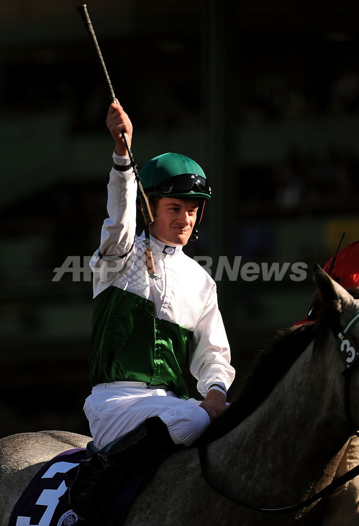 【10月25日 AFP】競馬、08ブリーダーズカップ・ワールド・チャンピオンシップ(2008 Breeders’Cup World Championships)フィリー&メアターフ。ジュリアン・レパルー(Julien Leparoux)騎手が騎乗のフォーエヴァートゥギャザー(Forever Together)が、外側から追い上げてゴール直前の競り合いを制し、2着のシーリーヒル(Sealy Hill)に3/4馬身差をつけて1と1/4マイル(約2012メートル)のフィリー&メアターフで勝利した。(c)AFP