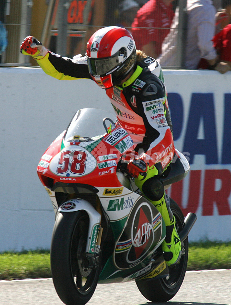 【10月27日 AFP】世界ロードレース選手権(WGP 2008)第18戦・バレンシアGP・250ccクラス決勝。ポールポジションからスタートしたメティス・ジレラ(Metis Gilera)のマルコ・シモンセッリ(Marco Simoncelli)は、43分29秒003を記録して最終戦でシーズン6勝目を挙げた。