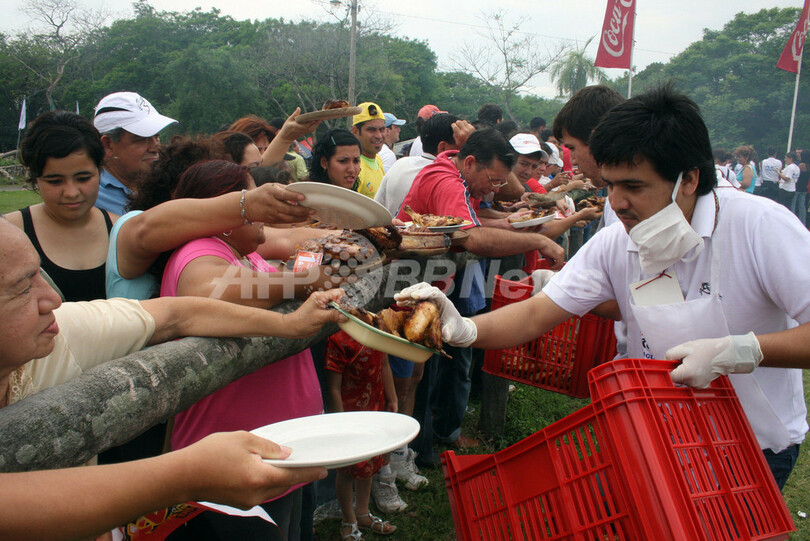 ニュース ライフ 8時間で22トンの豚肉食べたバーベキュー大会、パラグアイ 2008年10月28日 12:38 発信地:アスンシオン/パラグアイ [ 中南米 パラグアイ ] このニュースをシェア ‹ › ❮ 15/21 ❯ パラグアイの首都アスンシオン(Asuncion)近郊で開かれた白血病患者らを支援するバーベキュー大会会場で、バーベキュー肉をもらう人びと(2008年10月26日撮影)。(c)AFP/Jorge Romero 画像作成中 ! 【10月28日 AFP】パラグアイの首都アスンシオン(Asuncion)近郊で26日、白血病に苦しむ子どもたちや虐待を受けた女性たちを支援するバーベキュー大会が催された。8時間以内に22トンの豚肉が消費され、ギネス世界記録(Guinness Book of Records)を達成した。(c)AFP ライフ 一覧へ> メディア・報道関係・法人の方向け 写真・動画 購入のお問合せ>