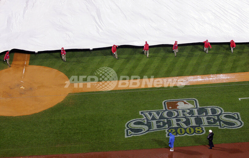 【10月28日 AFP】(記事更新)08MLBワールドシリーズ、フィラデルフィア・フィリーズ(Philadelphia Phillies)対タンパベイ・レイズ(Tampa Bay Rays)第5戦。試合は6回表を終えて2-2の同点で降雨によりサスペンデッドとなった。同シリーズ史上で試合がサスペンデッドになったのは初めて。