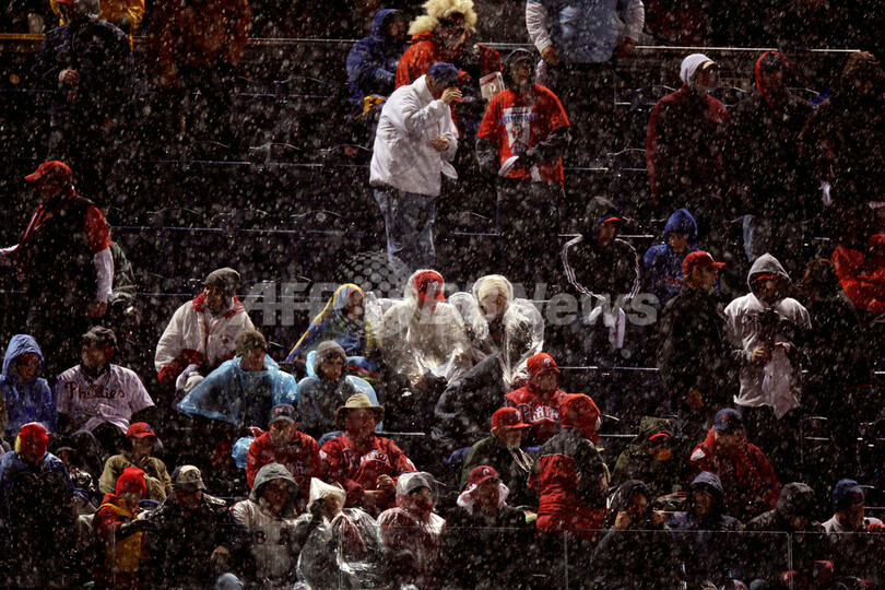 【10月28日 AFP】(記事更新)08MLBワールドシリーズ、フィラデルフィア・フィリーズ(Philadelphia Phillies)対タンパベイ・レイズ(Tampa Bay Rays)第5戦。試合は6回表を終えて2-2の同点で降雨によりサスペンデッドとなった。同シリーズ史上で試合がサスペンデッドになったのは初めて。