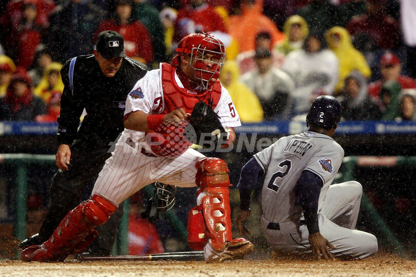 【10月28日 AFP】(記事更新)08MLBワールドシリーズ、フィラデルフィア・フィリーズ(Philadelphia Phillies)対タンパベイ・レイズ(Tampa Bay Rays)第5戦。試合は6回表を終えて2-2の同点で降雨によりサスペンデッドとなった。同シリーズ史上で試合がサスペンデッドになったのは初めて。