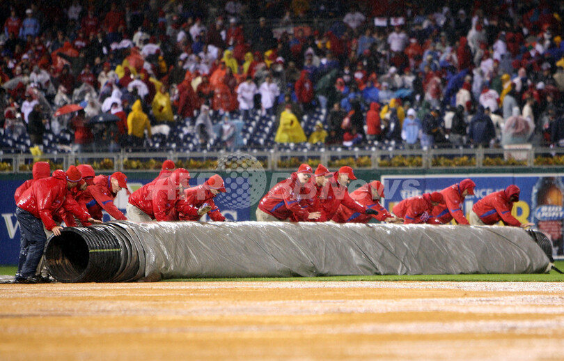 【10月28日 AFP】(記事更新)08MLBワールドシリーズ、フィラデルフィア・フィリーズ(Philadelphia Phillies)対タンパベイ・レイズ(Tampa Bay Rays)第5戦。試合は6回表を終えて2-2の同点で降雨によりサスペンデッドとなった。同シリーズ史上で試合がサスペンデッドになったのは初めて。