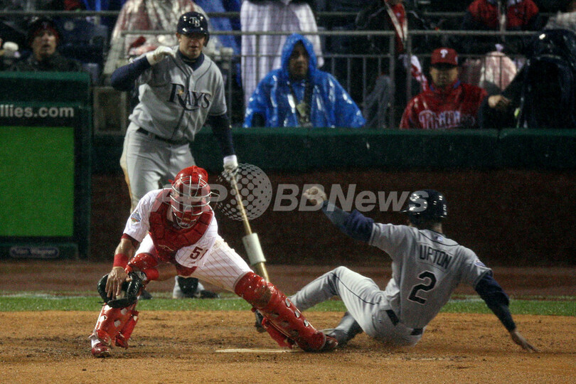 【10月28日 AFP】(記事更新)08MLBワールドシリーズ、フィラデルフィア・フィリーズ(Philadelphia Phillies)対タンパベイ・レイズ(Tampa Bay Rays)第5戦。試合は6回表を終えて2-2の同点で降雨によりサスペンデッドとなった。同シリーズ史上で試合がサスペンデッドになったのは初めて。