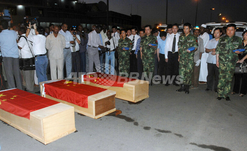 【10月29日 AFP】スーダン南部で今月18日、石油関連企業の中国人作業員9人が拉致されていた事件で、この作業員のうち3人の遺体と負傷した3人が28日、スーダンの首都ハルツーム(Khartoum)に到着した。同地では、遺体の本国送還を前に、国連(UN)の平和維持活動で同国に展開している中国軍によって軍葬が執り行なわれた。