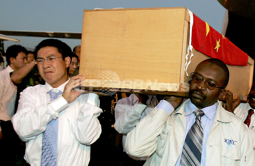 【10月29日 AFP】スーダン南部で今月18日、石油関連企業の中国人作業員9人が拉致されていた事件で、この作業員のうち3人の遺体と負傷した3人が28日、スーダンの首都ハルツーム(Khartoum)に到着した。同地では、遺体の本国送還を前に、国連(UN)の平和維持活動で同国に展開している中国軍によって軍葬が執り行なわれた。