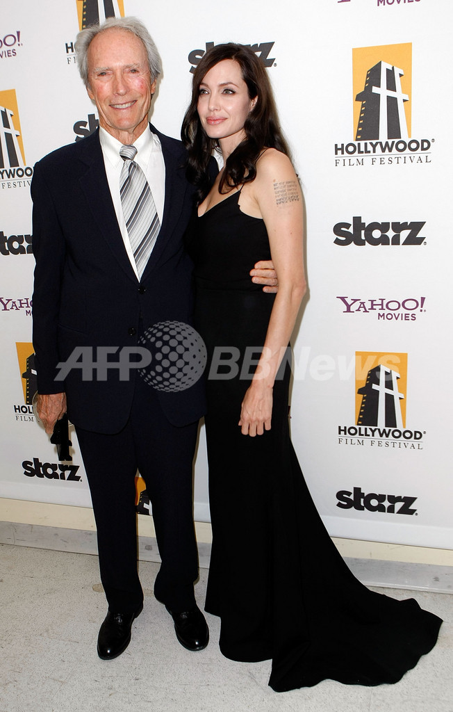 米ビバリーヒルズ(Beverly Hills)にあるビバリー・ ヒルトン・ホテル(Beverly Hilton Hotel)で開催された「第12回ハリウッド映画祭(Hollywood Film Festival)」の授賞式でDirector of the Yearを受賞した、俳優/監督のクリント・イーストウッド(Clint Eastwood、左)と、プレゼンターを務めた女優のアンジェリーナ・ジョリー(Angelina Jolie、2008年10月27日撮影)。(c)AFP/Getty Images/Michael Buckner