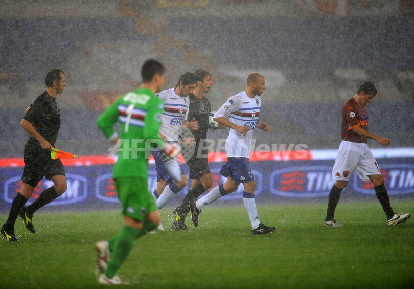 スポーツ サッカー ASローマ対サンプドリア戦は豪雨のため延期に 2008年10月30日 7:55 発信地:ローマ/イタリア [ ヨーロッパ イタリア ] このニュースをシェア ‹ › ❮ 7/8 ❯ 豪雨のためピッチを去る両チームの選手たち。(2008年10月29日撮影)(c)AFP/Filippo MONTEFORTE 画像作成中 ! 【10月30日 AFP】08-09イタリア・セリエA第9節、ASローマ(AS Roma)対サンプドリア(Sampdoria)。試合は、豪雨の為試合開始6分の時点で延期となった。 試合は開始後にまず一時中断となったものの、稲妻と豪雨の為その30分後に延期が決定された。主審が両チームの主将と話し合い、ボールが転がらないピッチの状況の為延期を宣告した。(c)AFP サッカー 一覧へ> メディア・報道関係・法人の方向け 写真・動画 購入のお問合せ>