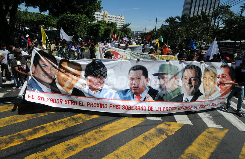 中米エルサルバドルの首都サンサルバドル(San Salvador)で、中南米の国家元首の顔写真が並ぶ横断幕を運ぶ学生ら。中米エルサルバドルの首都サンサルバドルで10月31日、同市で30日開幕した中南米諸国とスペイン、ポルトガルによるイベロアメリカ首脳会議(Ibero American Summit)に合わせ、中南米での若者の支援政策を求めるデモ行進が行われた(2008年10月31日撮影)。(c)AFP/MIGUEL ALVAREZ