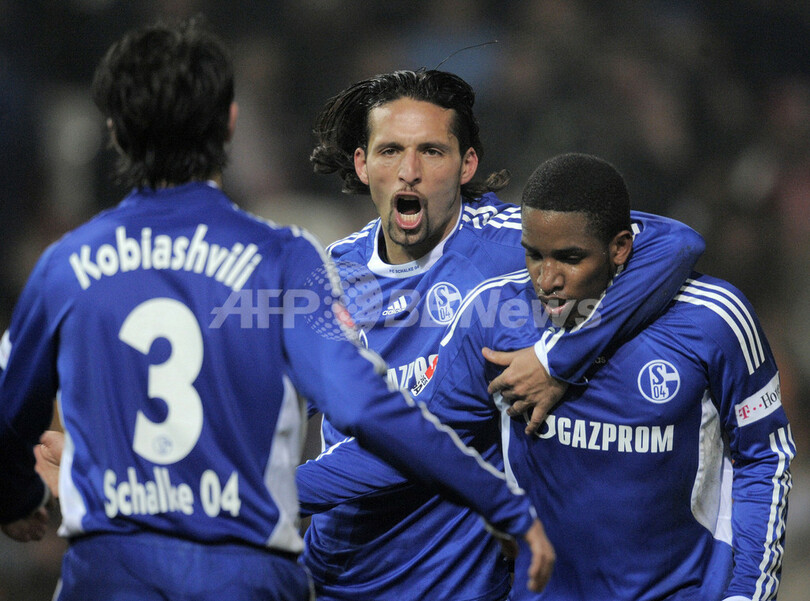 シャルケは後半35分にハイコ・ヴェステルマン(Heiko Westermann)のゴールで先制し、その後同45分にジェファーソン・ファルファン(Jefferson Farfan)がペナルティーキック(PK)を決めて勝利を収めた。(c)AFP/Ryland James