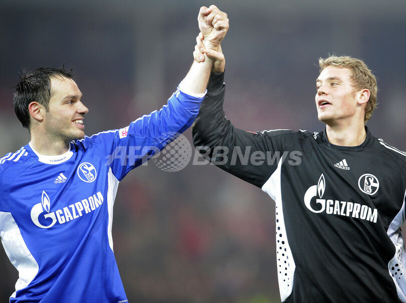 シャルケは後半35分にハイコ・ヴェステルマン(Heiko Westermann)のゴールで先制し、その後同45分にジェファーソン・ファルファン(Jefferson Farfan)がペナルティーキック(PK)を決めて勝利を収めた。(c)AFP/Ryland James