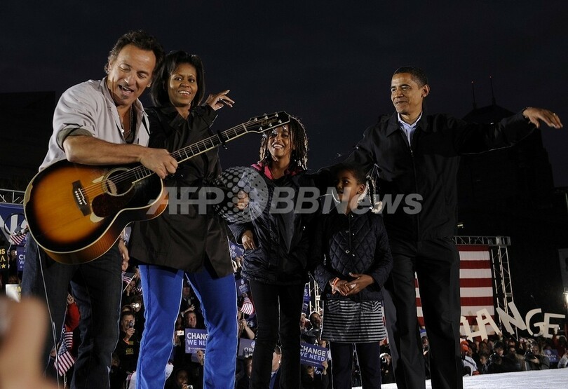 スプリングスティーンのステージが終わり、ミシェル(Michelle Obama)夫人や2人の子どもたちと壇上に上がったオバマ氏は、「人々の生活を歌い、アメリカ国民について語っている歌手は多くはない。スプリングスティーンはそんな数少ない歌手の1人だ」と称賛した。