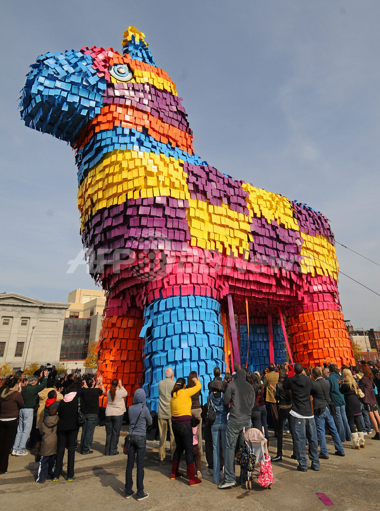 【11月3日 AFP】米ペンシルベニア(Pennsylvania)州フィラデルフィア(Philadelphia)に2日、長さ28.5メートル、高さ18.9メートル、幅7.2メートルの巨大ピニャータ(Pinata、メキシコなどで使われる、中にお菓子やおもちゃなどを詰めた紙製のくす玉人形)が登場した。
